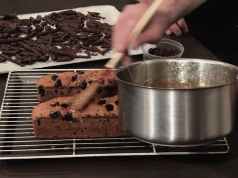 Нанесите топпинг в горячем виде на кексы с помощью кондитерской кисти. Распределите его по поверхности и по бокам кексов. Этот топпинг будет защищать кексы от высыхания, и также будет действовать как клей, удерживающий стружку из темного шоколада на поверхности кексов.